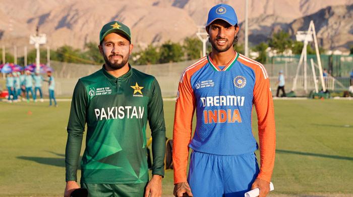 Pakistan Shaheens captain Mohammad Haris (L) and his Indian counterpart Tilak Varma pictured after the toss during their encounter at the ACC Emerging Teams Asia Cup 2024 on October 19, 2024. — PCB