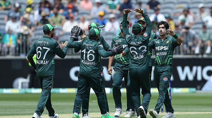 Pakistan players celebrate with Naseem Shah after he got the wicket of Australias Josh Inglis during the third one-day international (ODI) cricket match between Australia and Pakistan at the Perth Stadium in Perth on November 10, 2024. — AFP