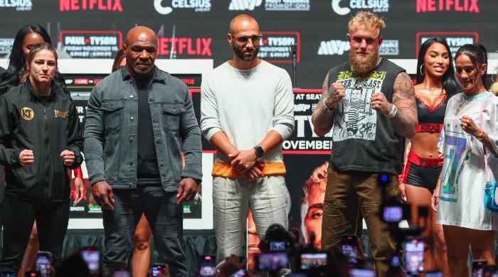 Jake Paul and Mike Tyson pose after the final press conference for their upcoming heavyweight fight at Toyota Music Factory in Irving, Texas, on November 13, 2024. —AFP