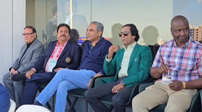 BCCI Secretary Rajeev Shukla (second from left) and PCB chairman Mohsin Naqvi (centre) watch the ICC Mens Champions Trophy semi-final between South Africa and New Zealand at the Gaddafi Stadium in Lahore on March 5, 2025. — PCB