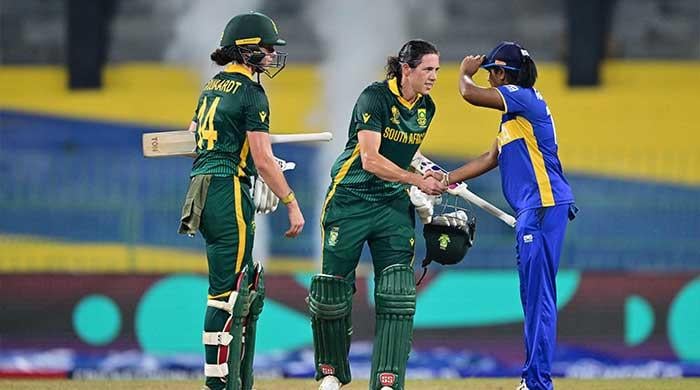 South Africas Laura Wolvaardt (L) and Tazmin Brits (C) shake hands with Sri Lankas Harshitha Samarawickrama (R) after winning the ICC Womens Cricket World Cup 2025 match against Sri Lanka at the R Premadasa International Cricket Stadium in Colombo on October 17, 2025. — AFP